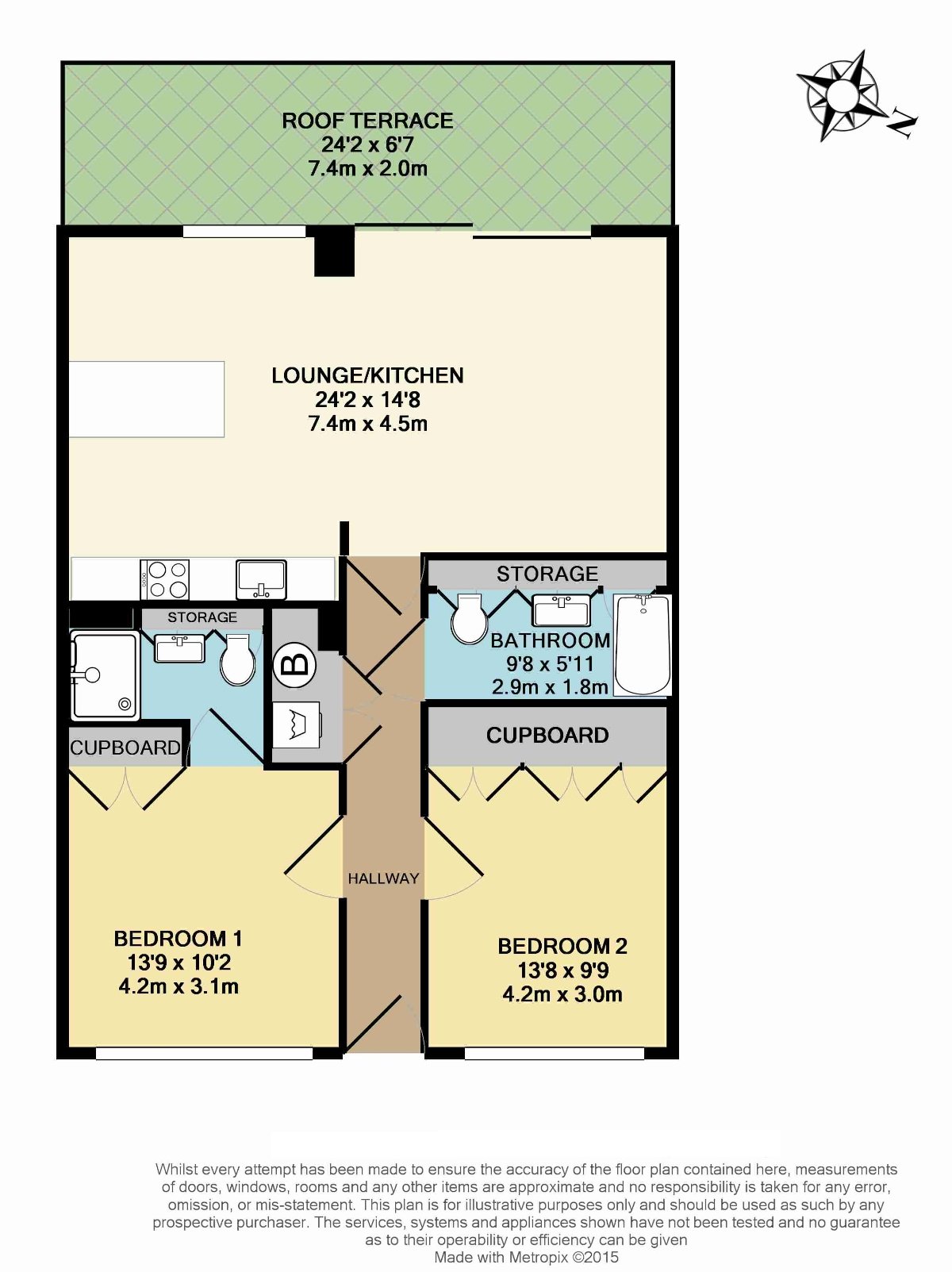 Reception/Kitchen 24'2 x 14'8, Bedroom 1 13'9 x 10'2, Bedroom 2 13'8 x 9'9, Bathroom 9'8 x 5'11