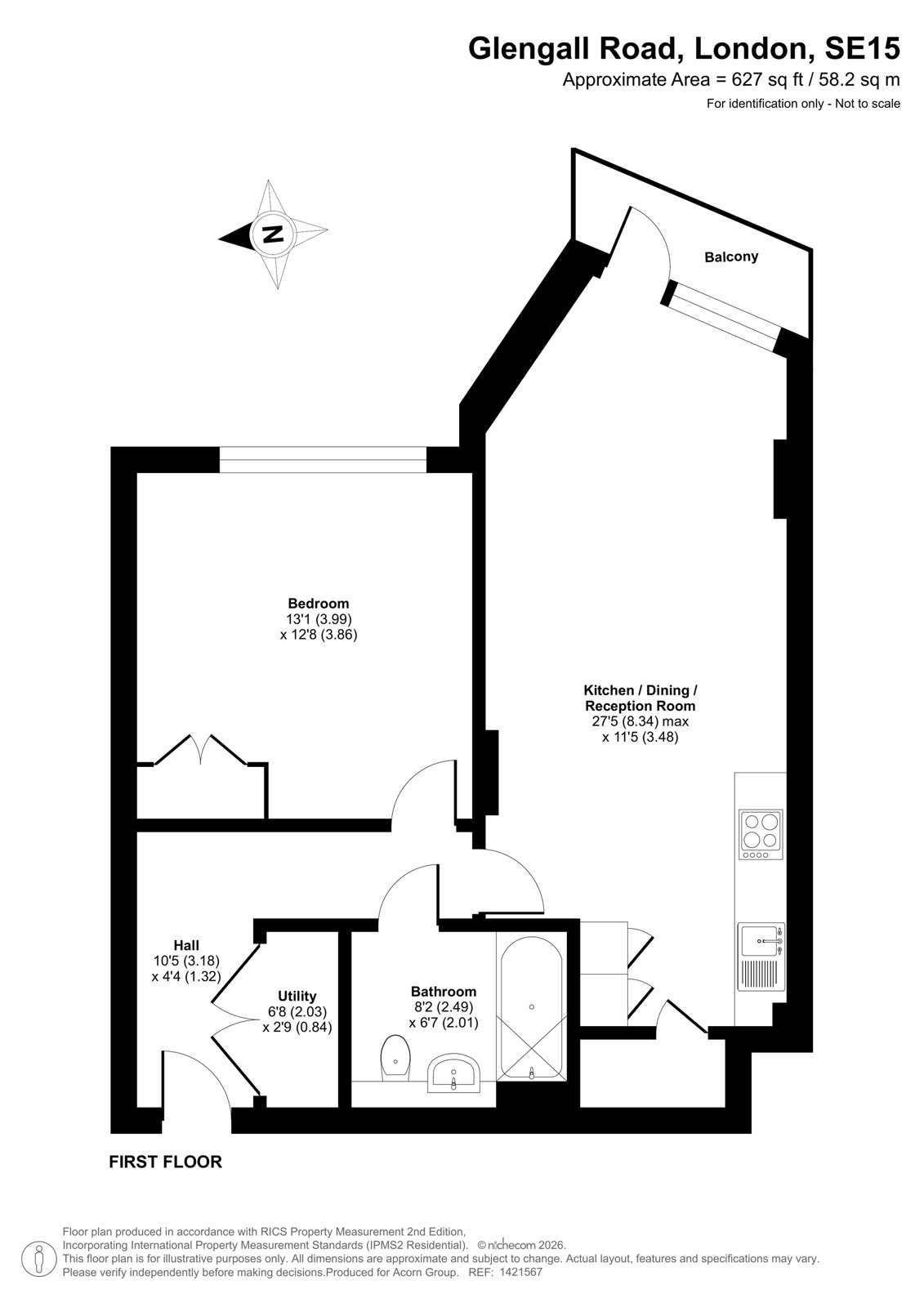 The double bedroom is well-proportioned and benefits from built-in storage, while the modern bathroom is centrally positioned and finished in a clean, contemporary style. A separate utility room and additional hallway storage add to the practicality of the layout.