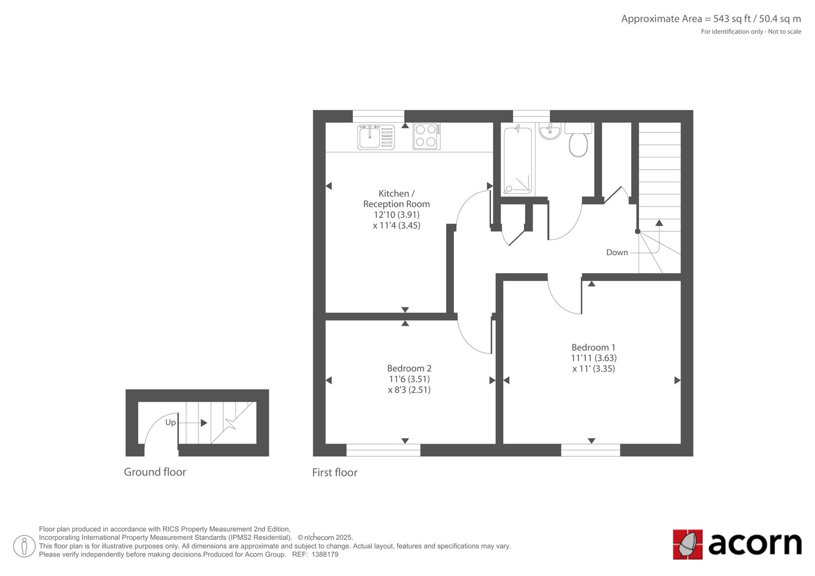 A private entrance at ground level opens to a staircase leading up to a central hallway, from which the entire home unfolds. The kitchen and reception room sit to the front and provide a generous, open space for cooking, dining and relaxing, with ample natural light enhancing the sense of openness. Both bedrooms are comfortable doubles, with the main bedroom positioned to the front and the second bedroom enjoying a quieter outlook to the rear. A well-appointed bathroom sits just off the hallway, alongside a useful storage cupboard.