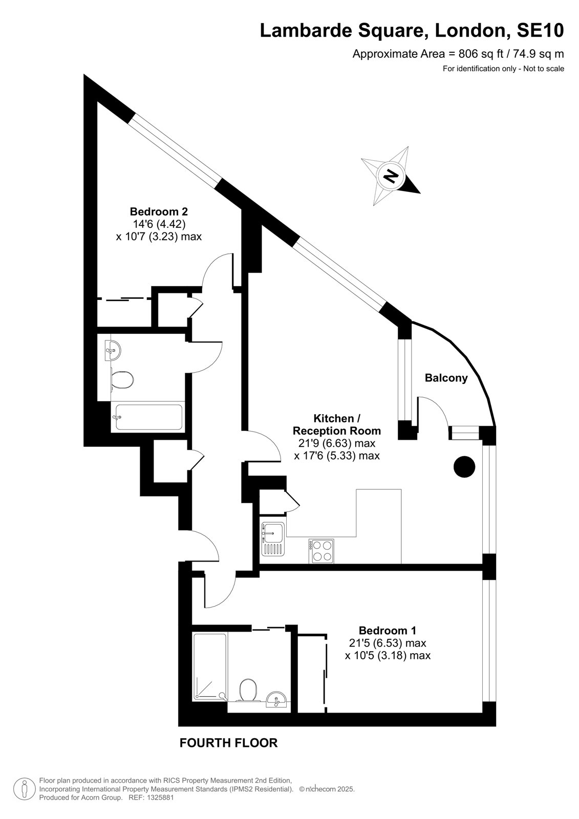 Set on the fourth floor, the property spans approximately 806 sq. ft. and boasts a well-designed layout that maximises space and natural light. The bright and airy open-plan kitchen/reception room features floor-to-ceiling windows, a sleek integrated kitchen, and direct access to a private curved balcony, ideal for relaxing or entertaining.