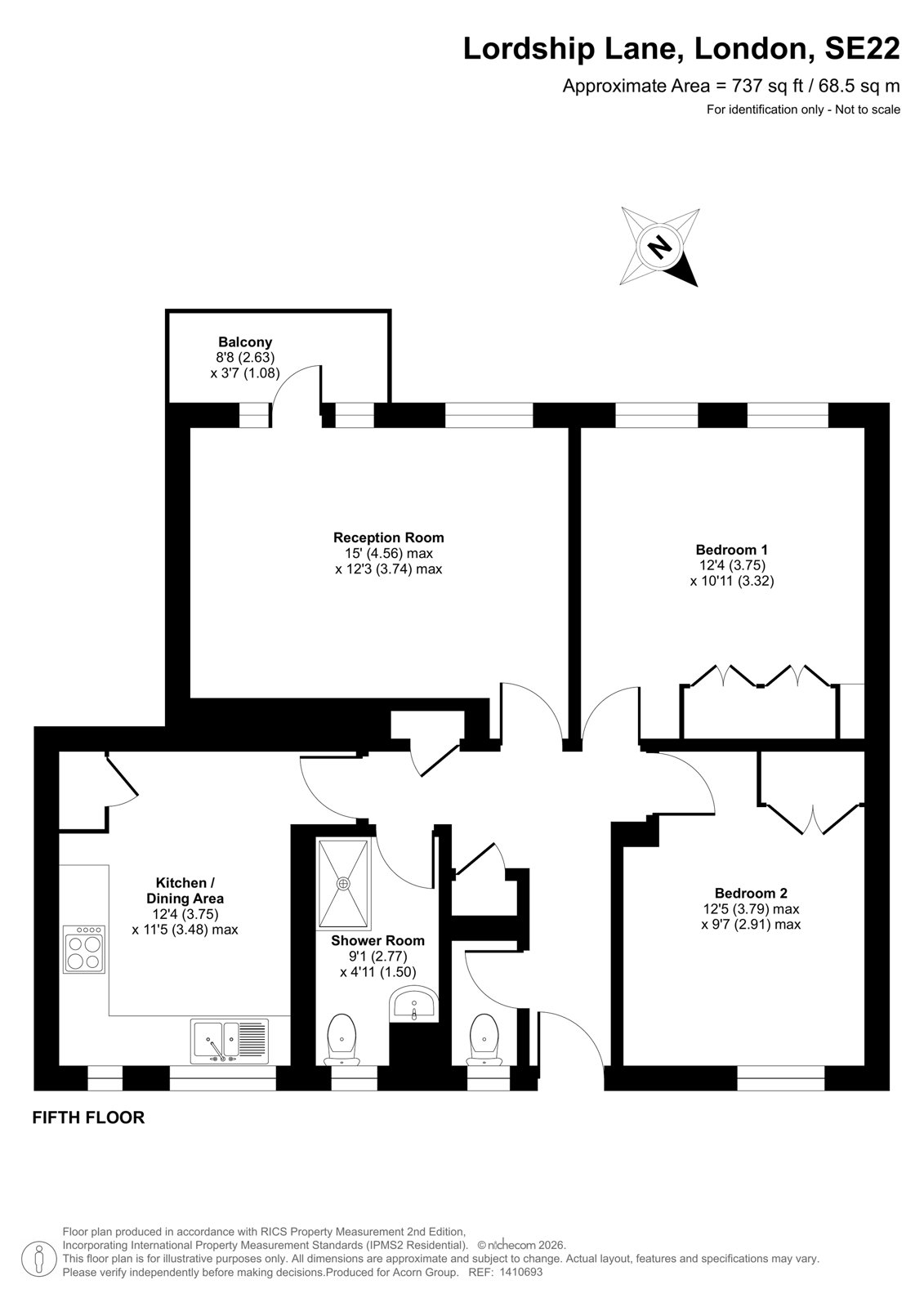 Situated on the fifth floor of the ever-popular Campbell Court, this bright and well-proportioned two-bedroom apartment offers approximately 737 sq ft (68.5 sq m) of internal space, a private balcony and far-reaching views across South East London.