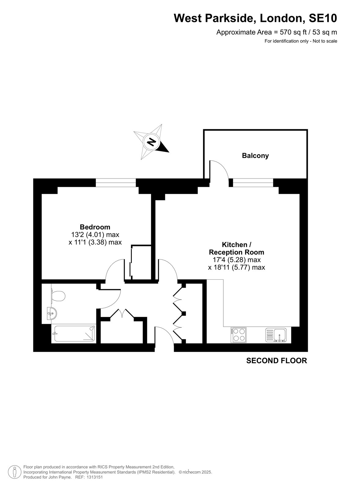 Situated on the second floor of Nasmyth House, the property spans approximately 570 sq ft (53 sq m) and boasts a generous open-plan kitchen/reception room (17’4 x 18’11 max) with direct access to a private south-west facing balcony – perfect for morning coffee or evening relaxation. The modern layout ensures an abundance of natural light, complemented by sleek flooring and a stylish colour scheme throughout.