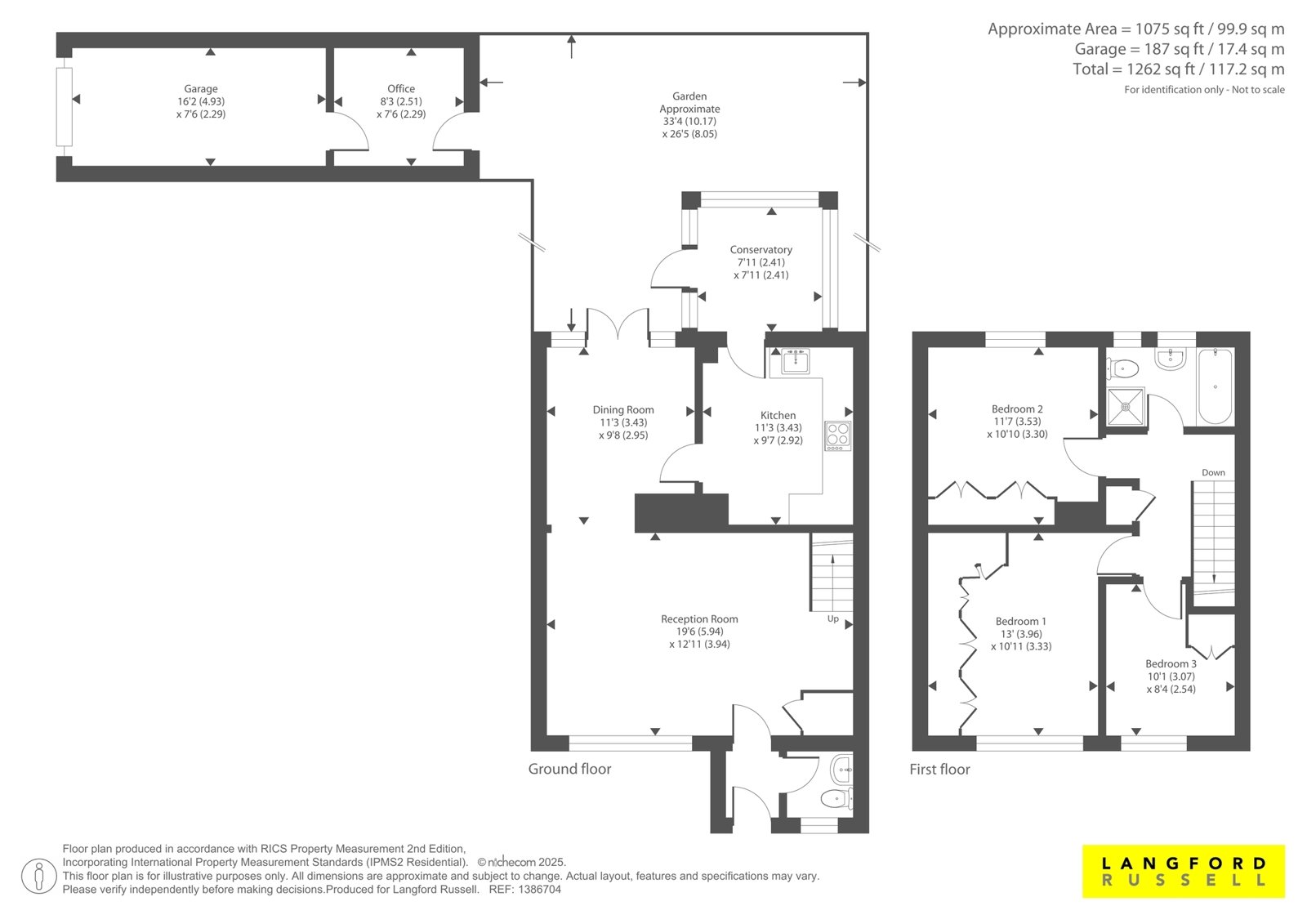 On the ground floor, the entrance hallway leads to a cloakroom and a front-facing sitting room. To the rear, the dining room opens onto the patio through French doors, creating an ideal space for entertaining. The modern kitchen is fitted with a selection of wall and base units and flows through to the conservatory.