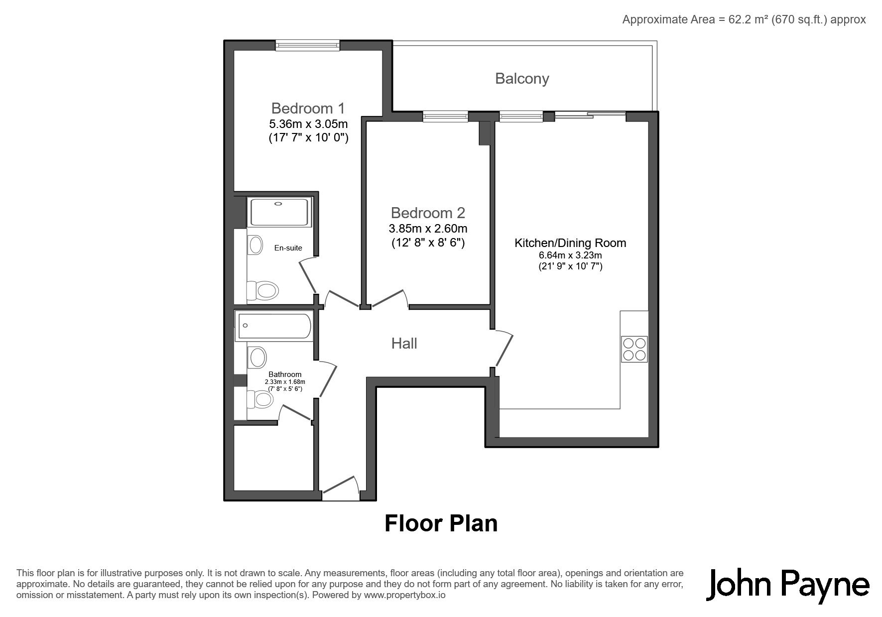 Bedroom 1 5.36m x 3.05m Bedroom 2 3.85m x 2.6m Bathroom 2.33m x 2.68m Kitchen 6.64m x 3.23m