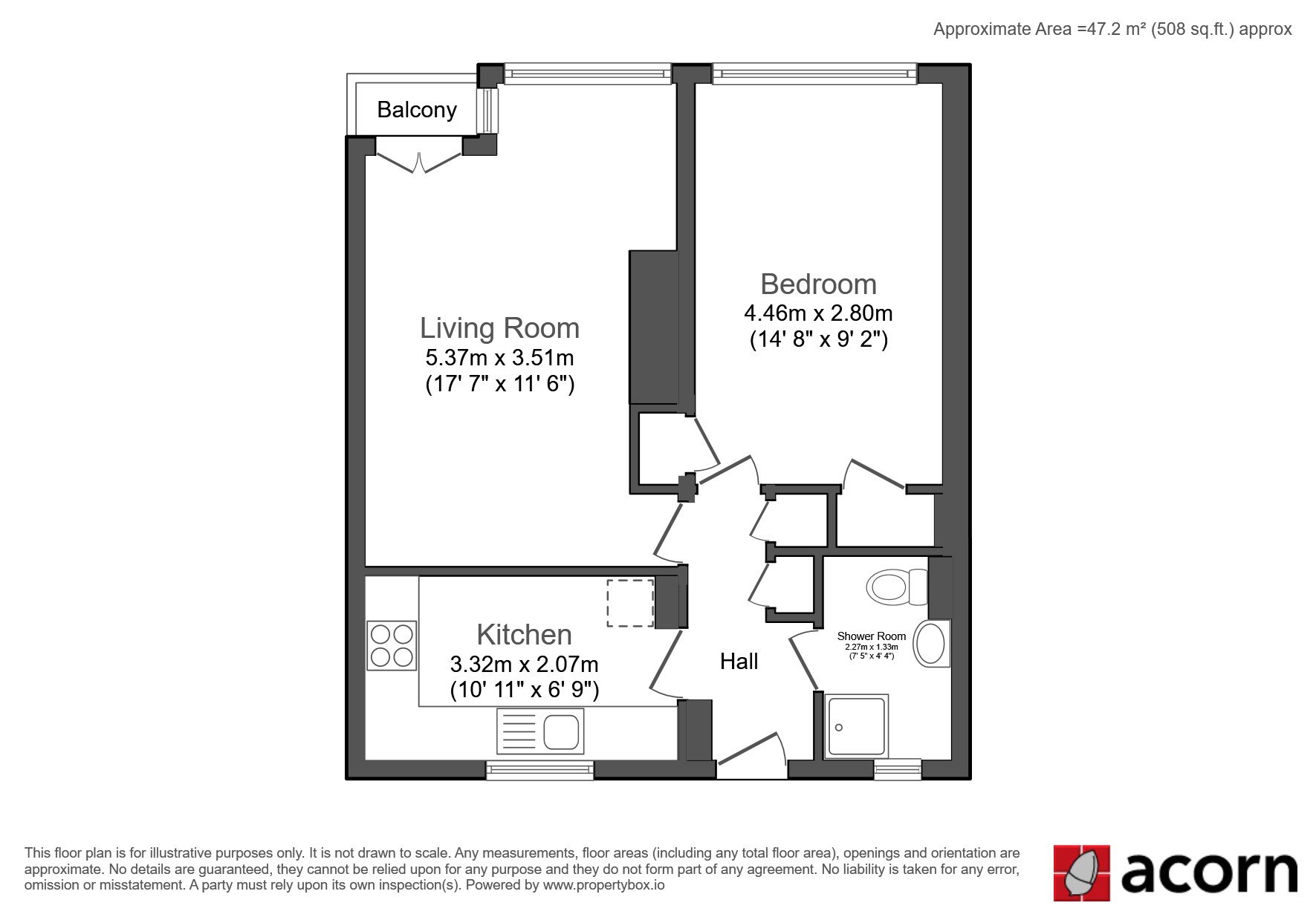 Living Room 17'7 x 11'6 (5.37m x 3.51m), Kitchen 10'11 x 6'9 (3.32m x 2.07m), Shower Room 7'5 x 4'4 (2.27m x 1.33), Bedroom 14'8 x 9'2 (4.46m x 2.8m)