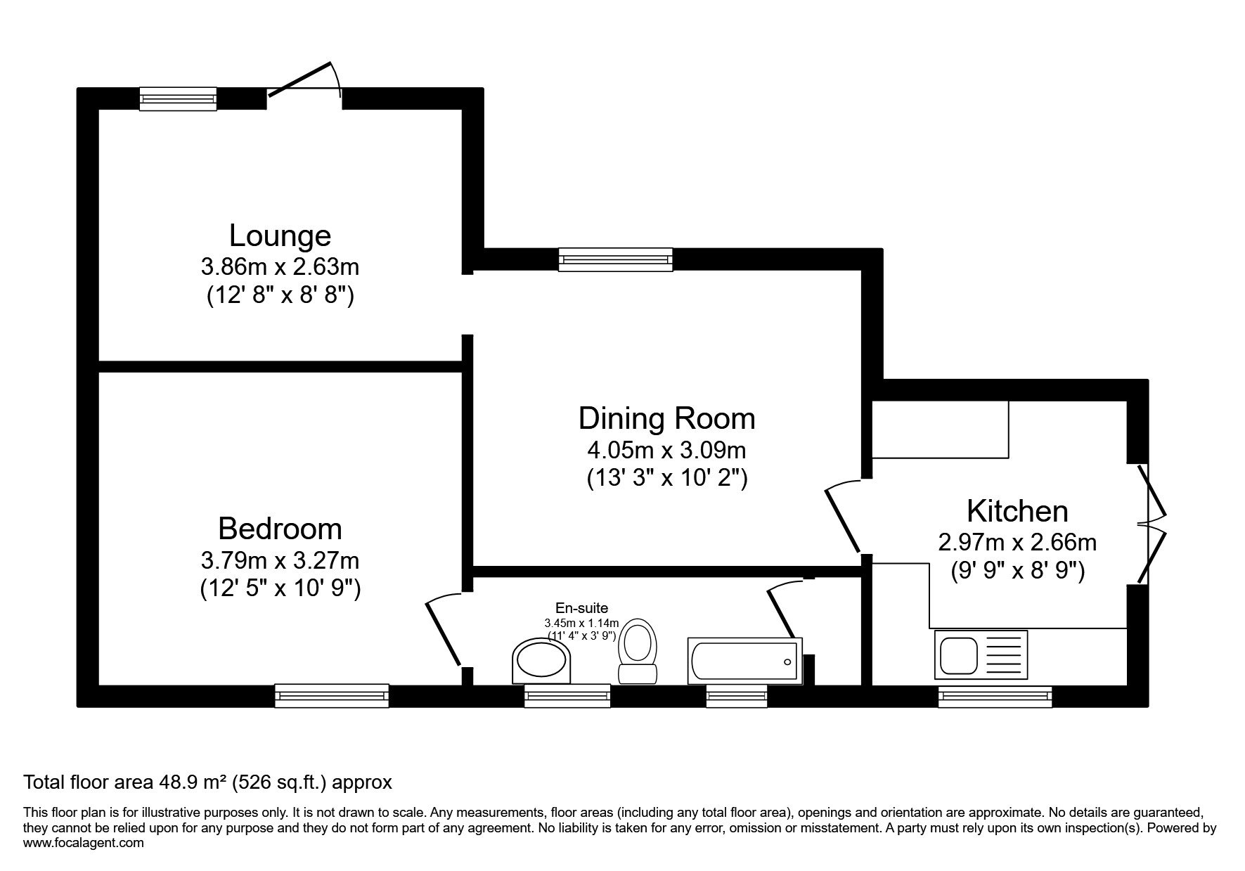 Reception 12'8 x 8'8 (3.86m x 2.63m), Dining Room 13'3 x 10'2 (4.05m x 3.09m), Kitchen 9'9 x 8'9 (2.97m x 2.66m), Bedroom 1 12'5 x 10'9 (3.79m x 3.27m), Bathroom 11'4 x 3'9 (3.45m x 1.14m)