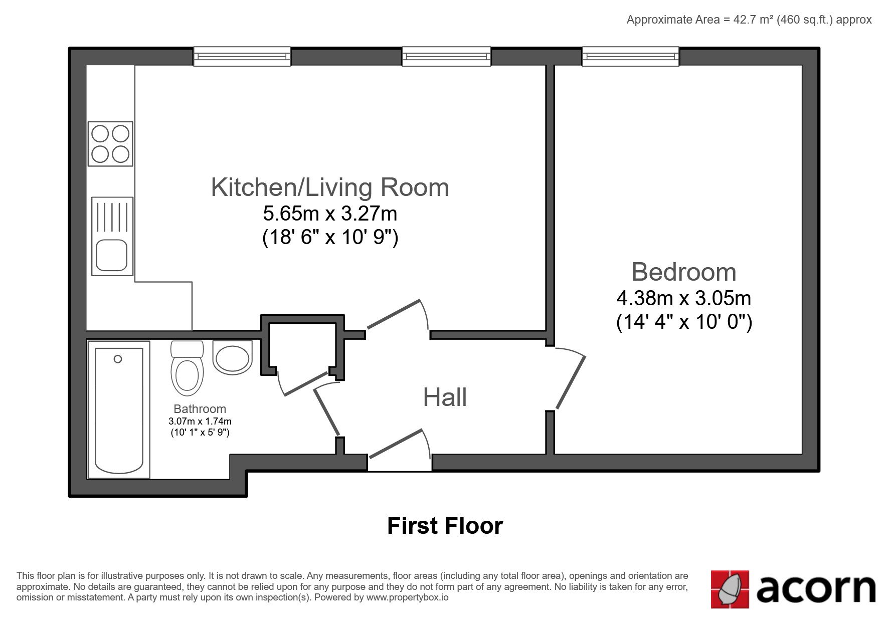 Kitchen/Lounge 5.65m x 3.27m (18’6” x 10’9”) Bedroom 4.38m x 3.05m (14’4” x 10’) Bathroom 3.07m x 1.74m (10’1” x 5’9”)