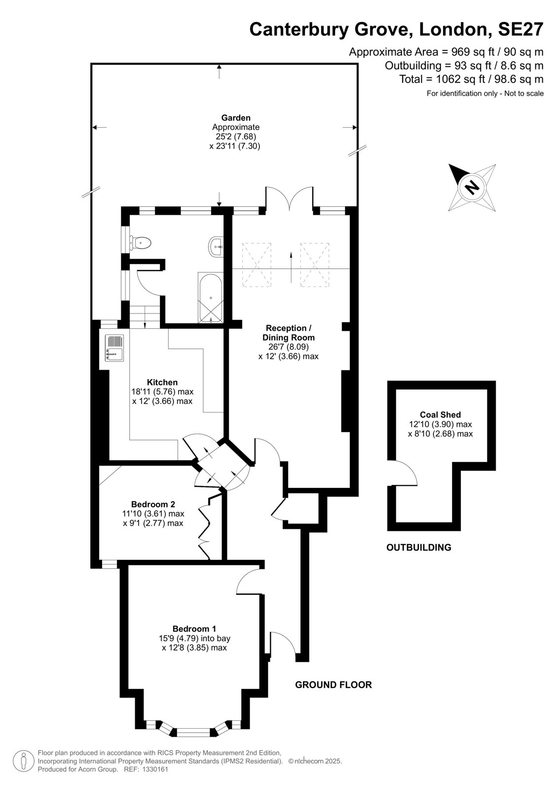 The interior boasts a spacious and light-filled front reception room, complete with a striking bay window and high ceilings that enhance the sense of space and grandeur. A well-proportioned second bedroom features bespoke fitted storage, while the sleek, fully integrated kitchen leads seamlessly to a chic, on-trend three-piece bathroom. To the rear, the heart of the home reveals itself in an impressive 26ft open-plan kitchen/living/dining area—ideal for entertaining or relaxed day-to-day living. French doors open directly onto a private, low-maintenance garden, offering a peaceful retreat and benefiting from additional outdoor storage via a charming original coal shed.