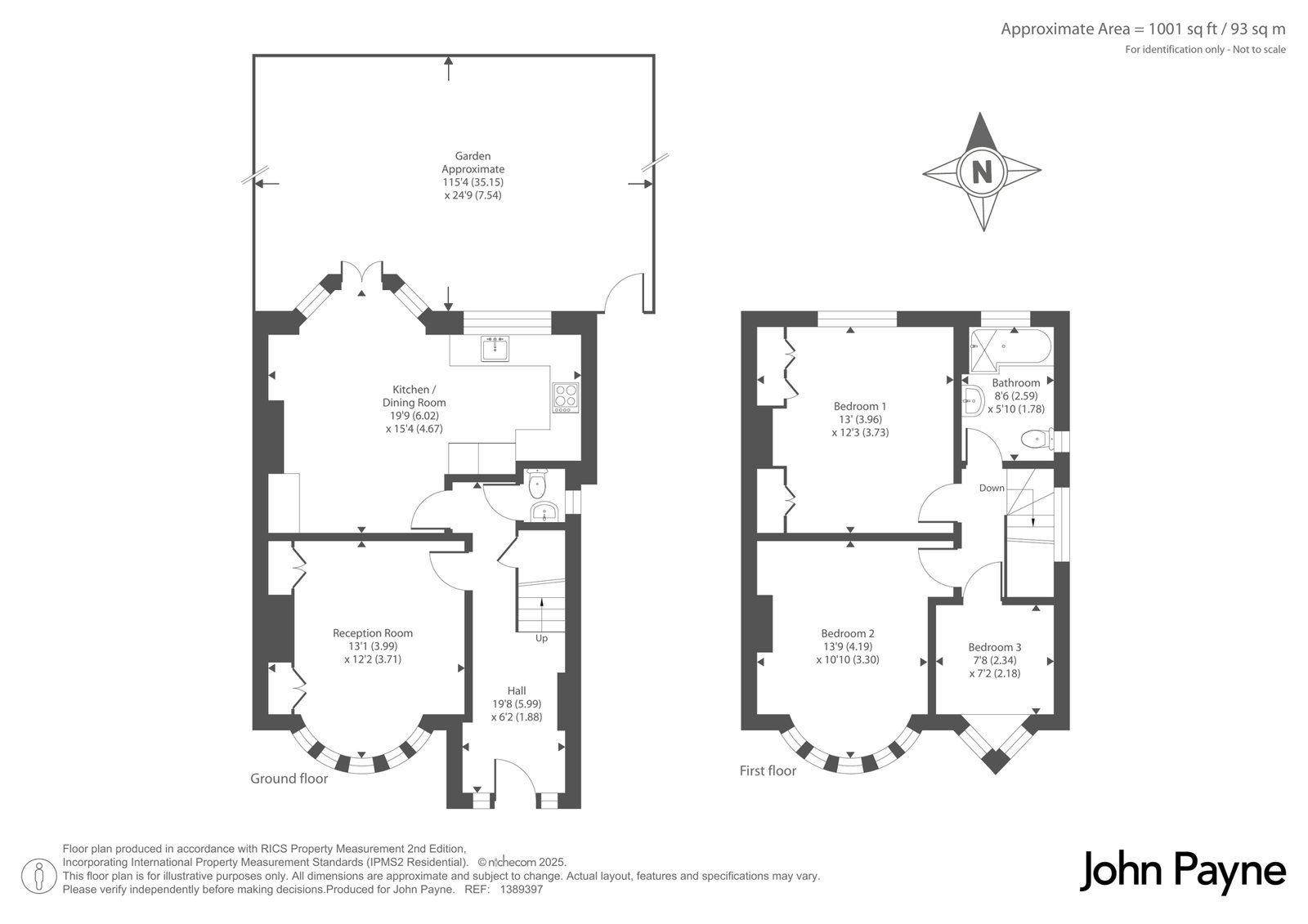 The first floor provides three bedrooms arranged around the landing. The principal bedroom is a generous double room overlooking the rear garden, while the second bedroom, also a double, benefits from a bay window to the front of the house. The third bedroom is ideal as a child’s room, study or home office. A contemporary family bathroom serves all bedrooms and is fitted with a modern suite.