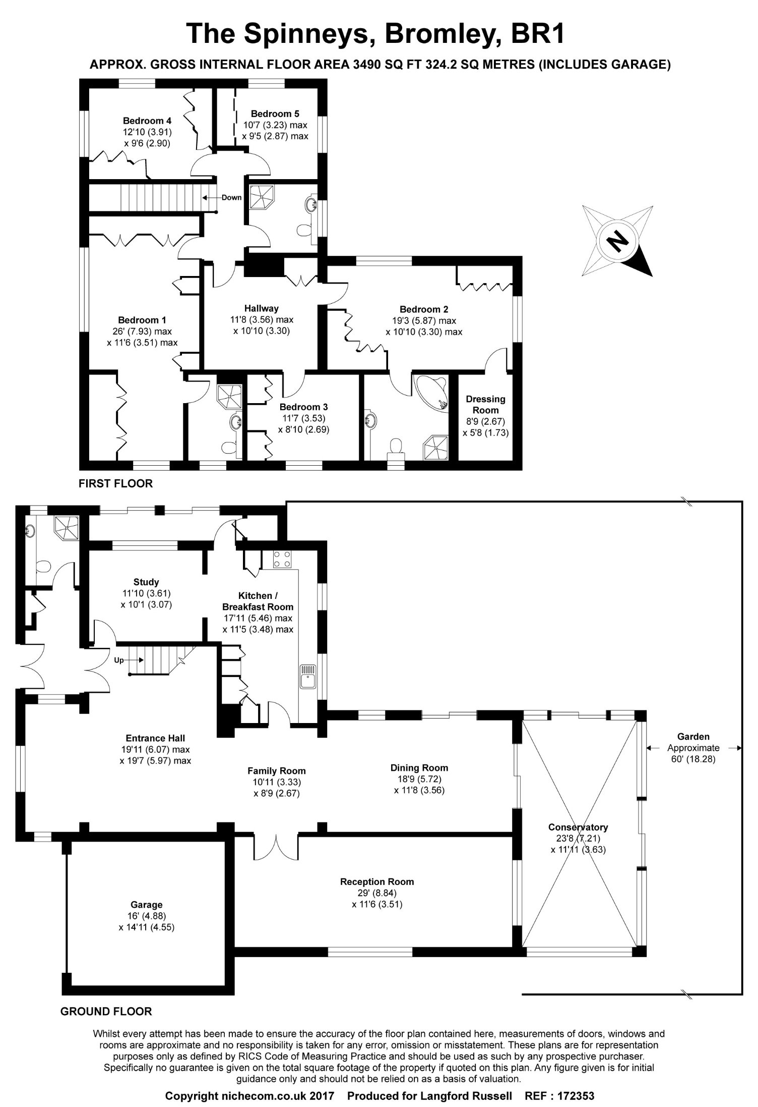 Entrance Hall 19'11 x 19'7 (6.07m x 5.97m), Garage 16' x 14'11 (4.88m x 4.55m), Study 11'10 x 10'1 (3.61m x 3.07m), Kitchen/Breakfast Room 17'11 x 11;5 (5.46m x 3.48m), Family Room 10'11 x 8'9 (3.33m x 2.67m), Dining Room 18'9 x 11'8 (5.72m x 3.56m), Reception Room 29' x 11'6 (8.84m x 3.51m), Conservatory 23'8 x 11'11 (7.21m x 3.63m), Garden 60' (18.28m), First Floor Hallway 11'8 x 10'10 (3.56m x 3.30m), Bedroom 1 26' x 11'6 (7.93m x 3.51m), Bedroom 2 19'3 x 10'10 (5.87m x 3.30m), Dressing Room 8'9 x 5'8 (2.67m x 1.73m), Bedroom 3 11'7 x 8'10 (3.53m x 2.69m), Bedroom 4 12'10 x 9'6 (3.91m x 2.90m), Bedroom 5 10'7 x 9'6 (3.23m x 2.87m) To check broadband and mobile phone coverage please visit Ofcom here ofcom.org.uk/phones-telecoms-and-internet/advice-for-consumers/advice/ofcom-checker