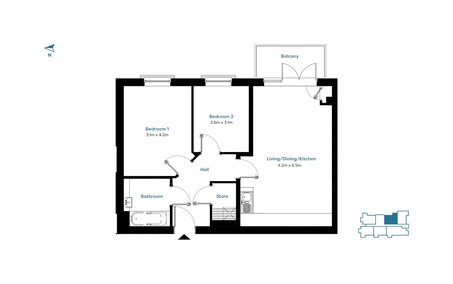 Reception 4.2m x 6.5m, Bedroom 1 3.1m x 4.2m, Bedroom 2.6m x 3.1m