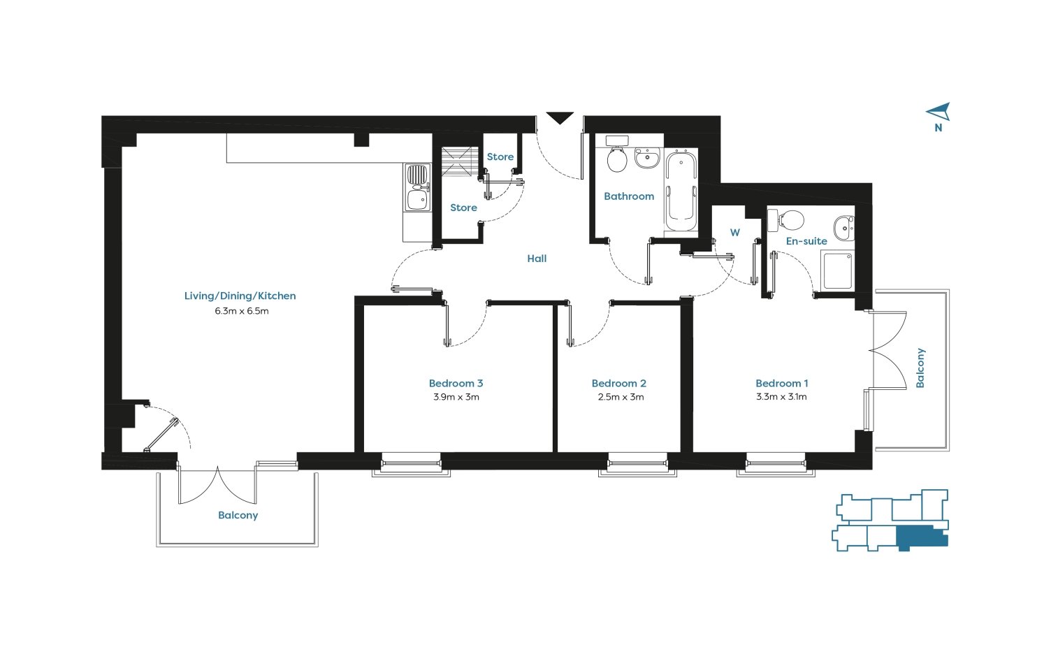 Reception/Kitchen 6.3m x 6.5m, Bedroom 1 3.3m x 3.1m, Bedroom 2 2.5m x 3m, Bedroom 3.9m x 3m