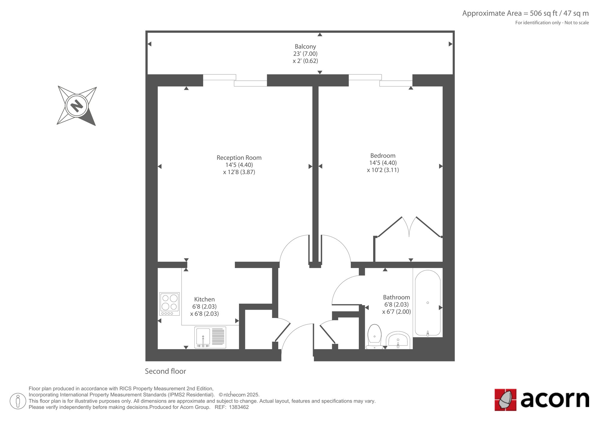 The heart of the property is the generous reception room, a naturally bright space with direct access to a 23 ft balcony that spans the width of both the living area and the bedroom, ideal for relaxing or enjoying a morning coffee. The reception room goes seamlessly into the thoughtfully arranged and efficiently designed kitchen. The bedroom mirrors the reception room in size and light, also benefiting from access to the balcony, while the bathroom is modern and neatly presented with a full-size bath and smart fittings. With approximately 506 sq ft (47 sq m) of internal space, the apartment is well laid out, offering comfortable living and good storage potential. Its modern design, clean lines, and practical flow make it well suited to first-time buyers, downsizers, or investors alike.