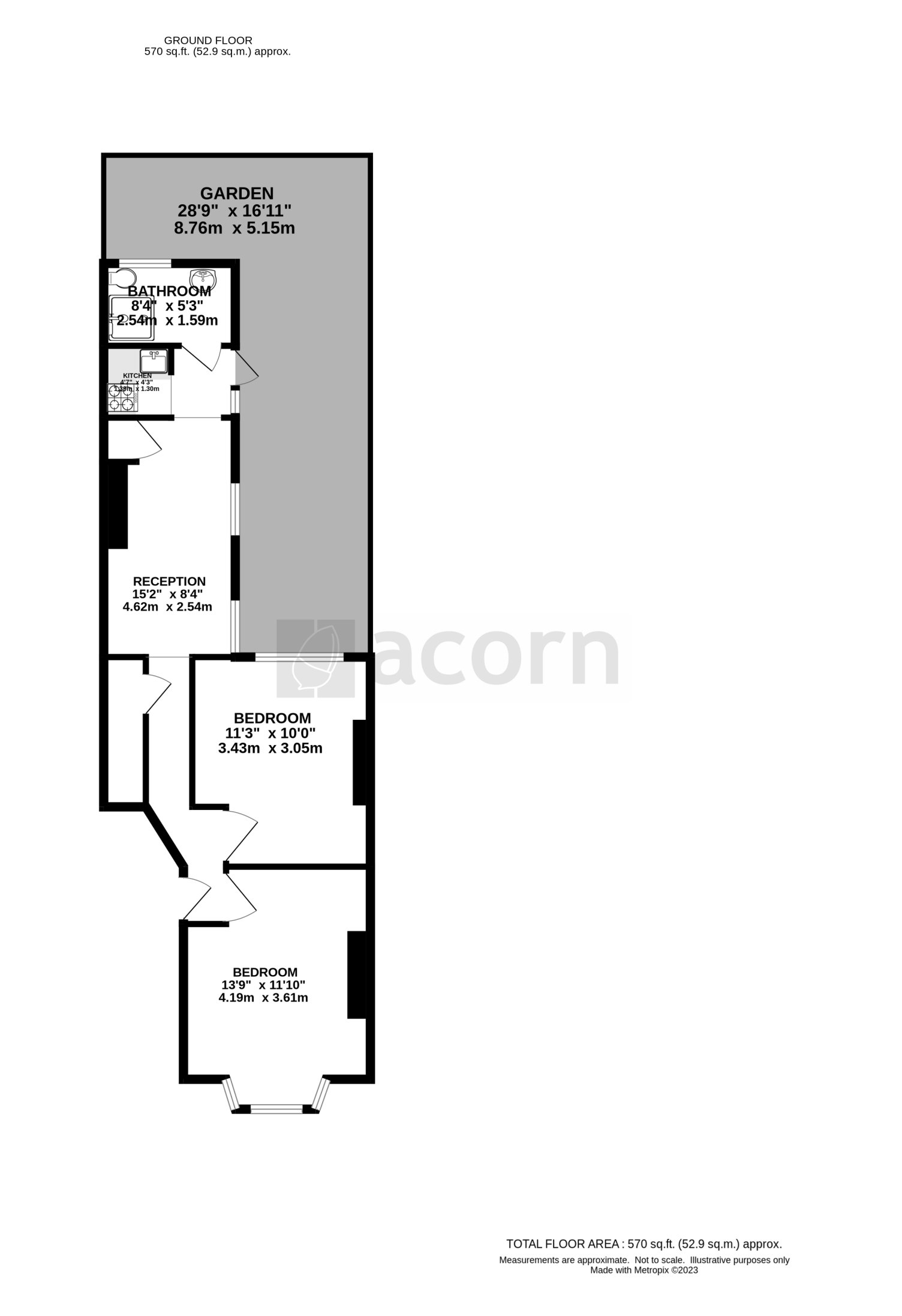 Reception: 15'2 x 8'4 Bedroom: 13'9 x 11'10 Bedroom: 11'3 x 10'0 Bathroom: 8'4 x 5'3 Garden: 28'9 x 16'11 Kitchen: Room dimensions pending verification.
