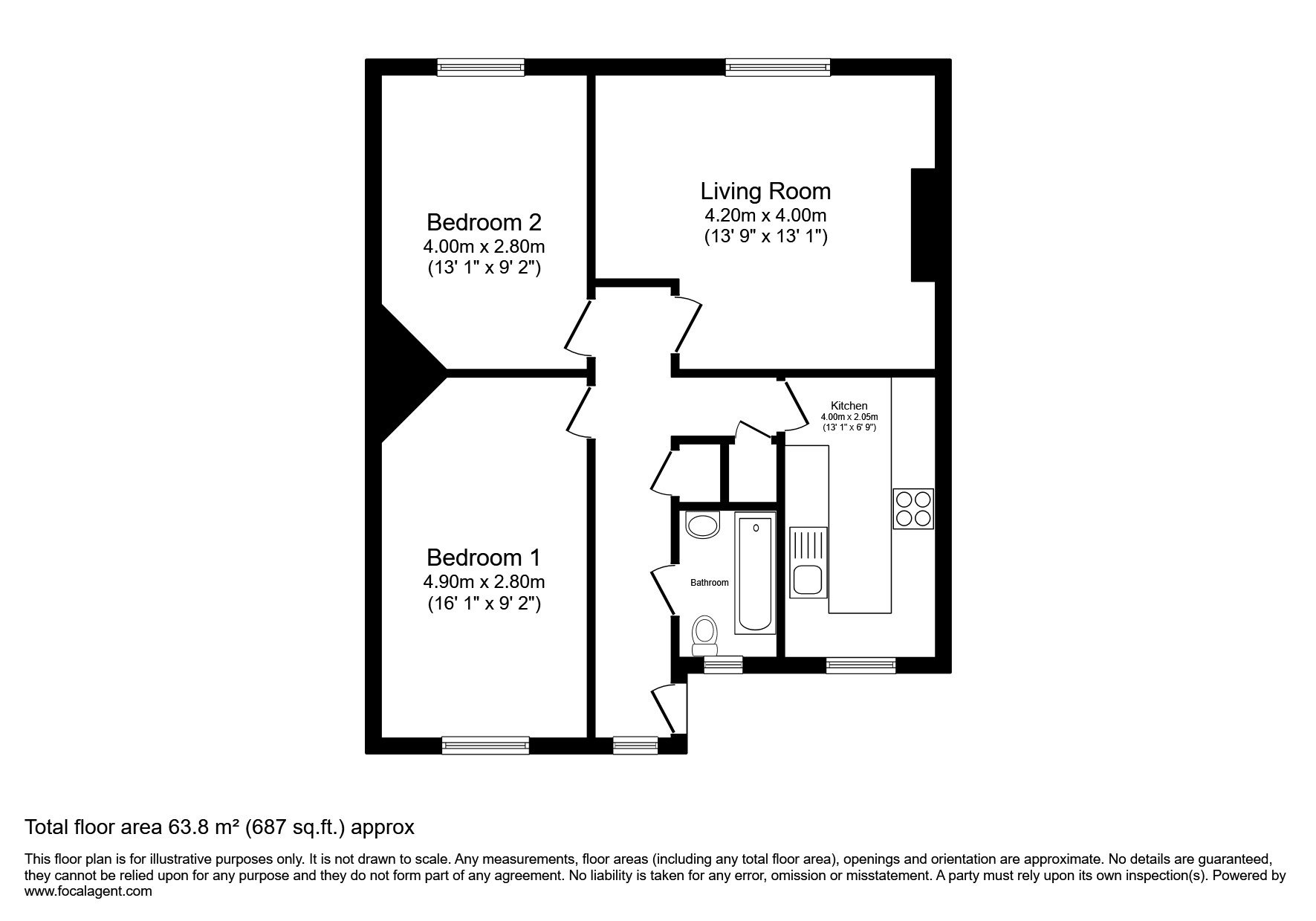 Kitchen: 11'7 x 6'11 Reception: 14'5 x 13'9 Bedroom 1: 14'2 x 9'7 Bedroom 2: 16'7 x 9'3 Bathroom: 7'7 x 4'2 Hallway: Room dimensions pending verification.