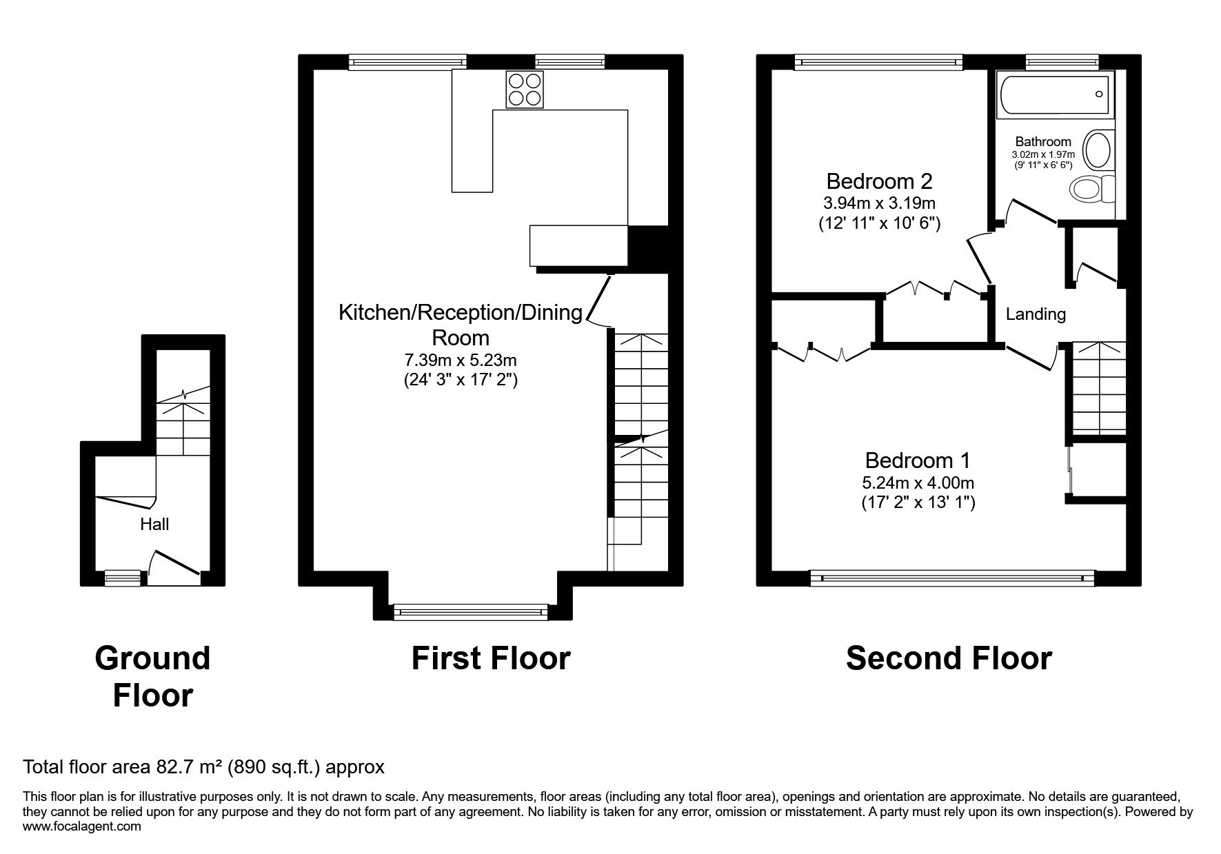 Kitchen/Reception Room 7.39m x 5.23m (24'3" x 17'2") Bedroom One 5.24m x 4m (17'2" x 13'1") Bedroom Two 3.94m x 3.19m (12'11" x 10'6") Bathroom 3.02m x 1.97m (9'11" x 6'6")