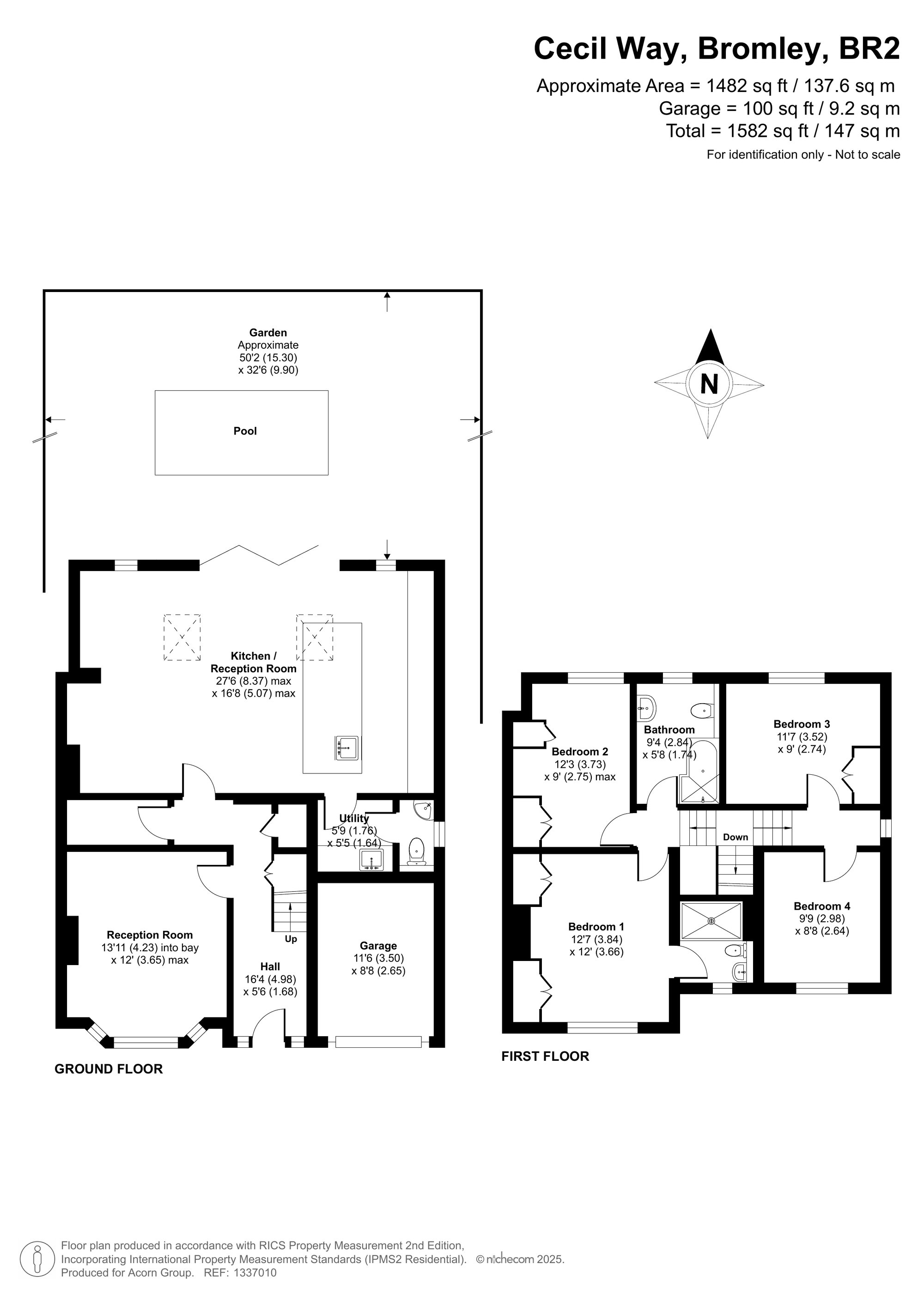 Reception 13'11 x 12' (4.23m x 3.65m), Hallway 16'4 x 5'8 (4.98m x 1.88m), Garage 11'6 x 8'8 (3.50m x 2.65m), Utility Room 5'9 x 5'5 (1.76m x 1.64m), Kitchen/Reception 27'8 x 16'8 (8.37m x 5.07m), Bedroom 1 12'7 x 12' (3.84m x 3.86m), Bedroom 2 12'3 x 9' (3.73m x 2.75m), Bedroom 3 11'7 x 9' (3.52m x 2.74m), Bedroom 4 9'9 x 8'8 (2.98m x 2.64m), Bathroom 9'4 x 5'8 (2.84m 1.74m)