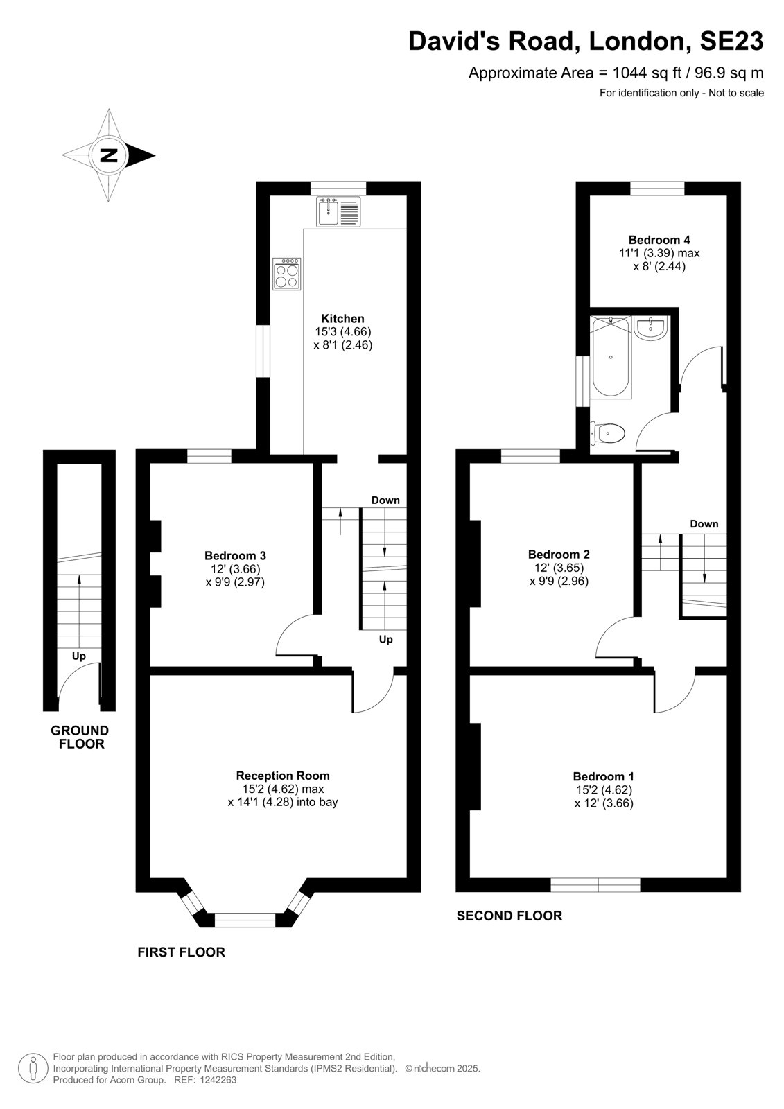 The flat is arranged over two levels, with its entrance leading upstairs to the first floor. Here, you’ll find a separate kitchen, a good-sized double bedroom, and a spacious living room featuring wood flooring and large bay windows that fill the space with natural light. Moving up to the second floor, there are three further bedrooms, two of which are well-proportioned doubles, while the third makes for a perfect single bedroom or home office, and finally a family bathroom to complete the home.