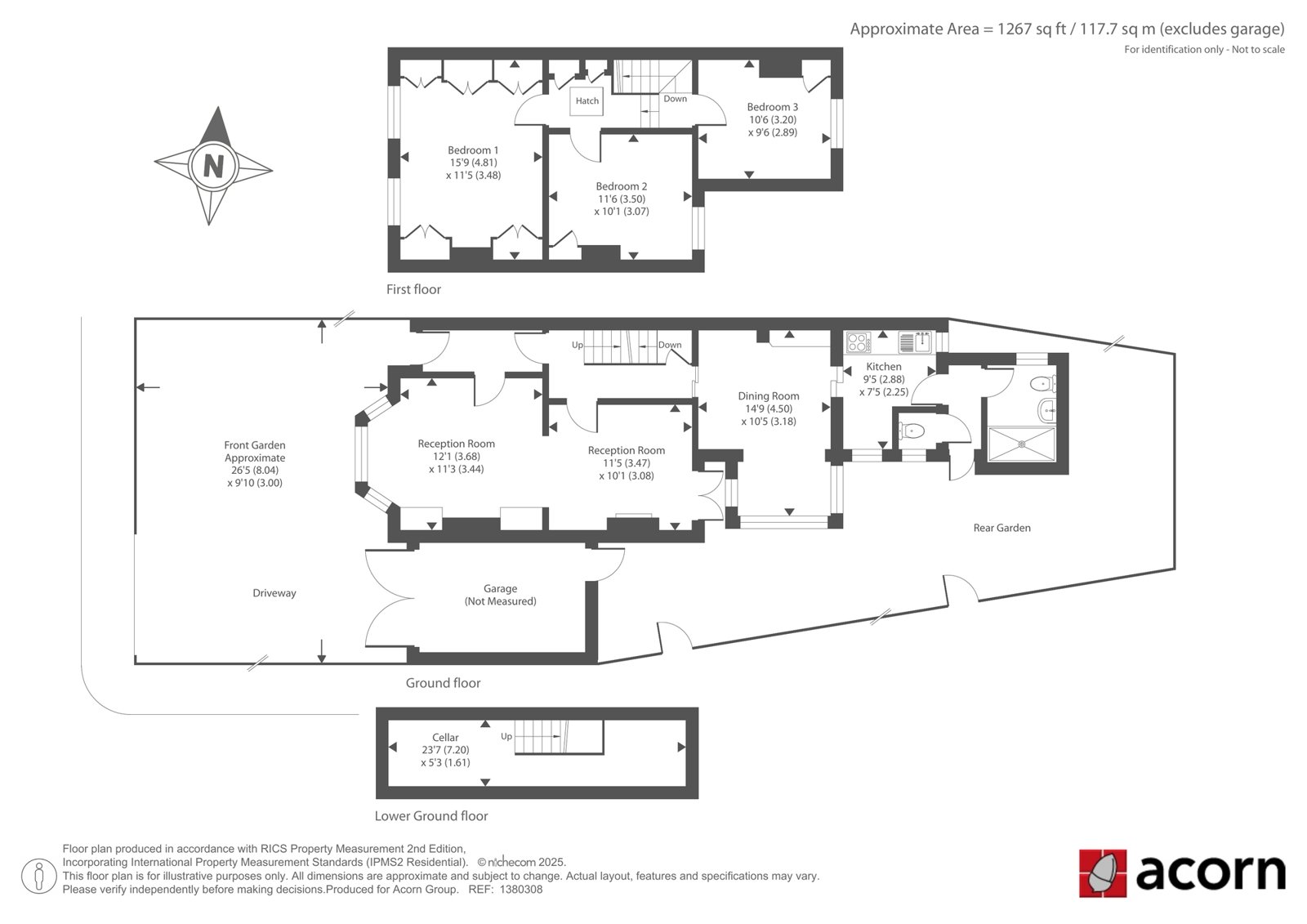 Upstairs, the first floor comprises three generous bedrooms. The principal bedroom spans the full width of the property with two windows flooding the room with plenty of light. Bedrooms two and three are both well sized and share access to a central landing with access to loft space – once again could extend STPP. Externally, the property benefits from a walled front and rear garden offering scope for landscaping or extension (subject to the usual consents). The attached garage provides valuable off-street parking or workshop space, and potential for extension, a super rare find in such a central SE13 location.