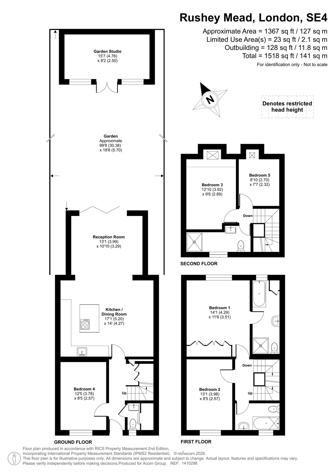 Acorn are delighted to present this substantial and beautifully upgraded five-bedroom mid-terrace home, arranged over three floors and extending to approximately 1,518 sqft including the external studio. The ground floor comprises a spacious 17'7 kitchen/dining room featuring stone worktops, a central island and generous storage, creating an ideal space for both everyday living and entertaining. This flows seamlessly into a bright 13'1 rear reception room with bi-fold doors leading to the impressive 100ft private garden.